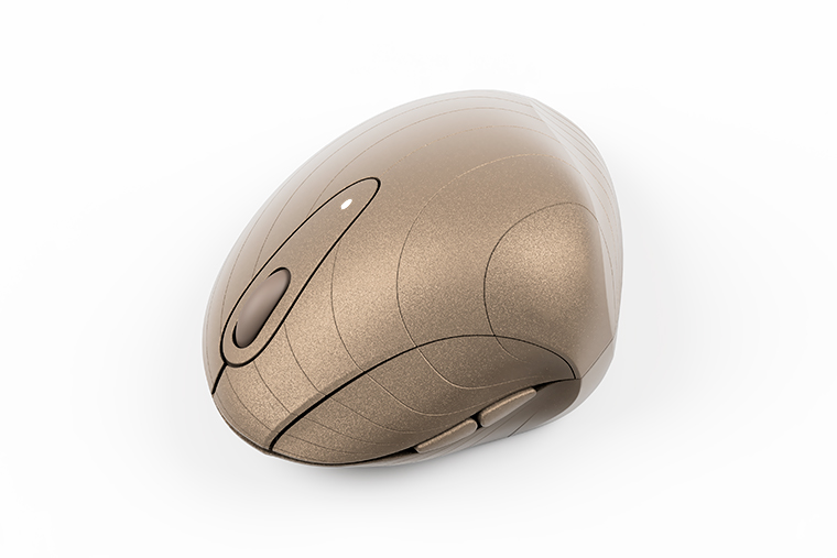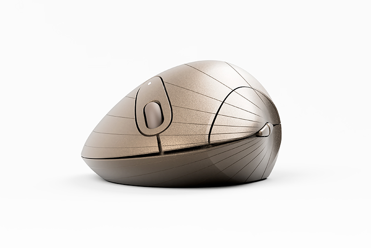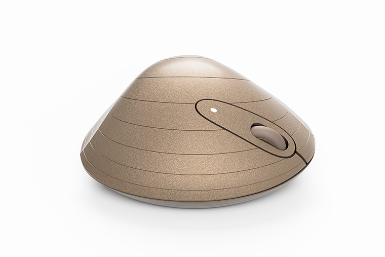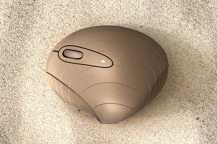 大アサリやホンビノスガイの貝殻がなんとも手になじむことに気づき、マウスデザインのモチーフにしました。貝の蝶番付近の造形は、成型しやすく且つ親指のおさまりが良いようにデフォルメしています。成長線と呼ばれる貝殻の同心円状の模様を再現することで、有機的な曲面が際立ち、見た目のおもしろさが出ました。